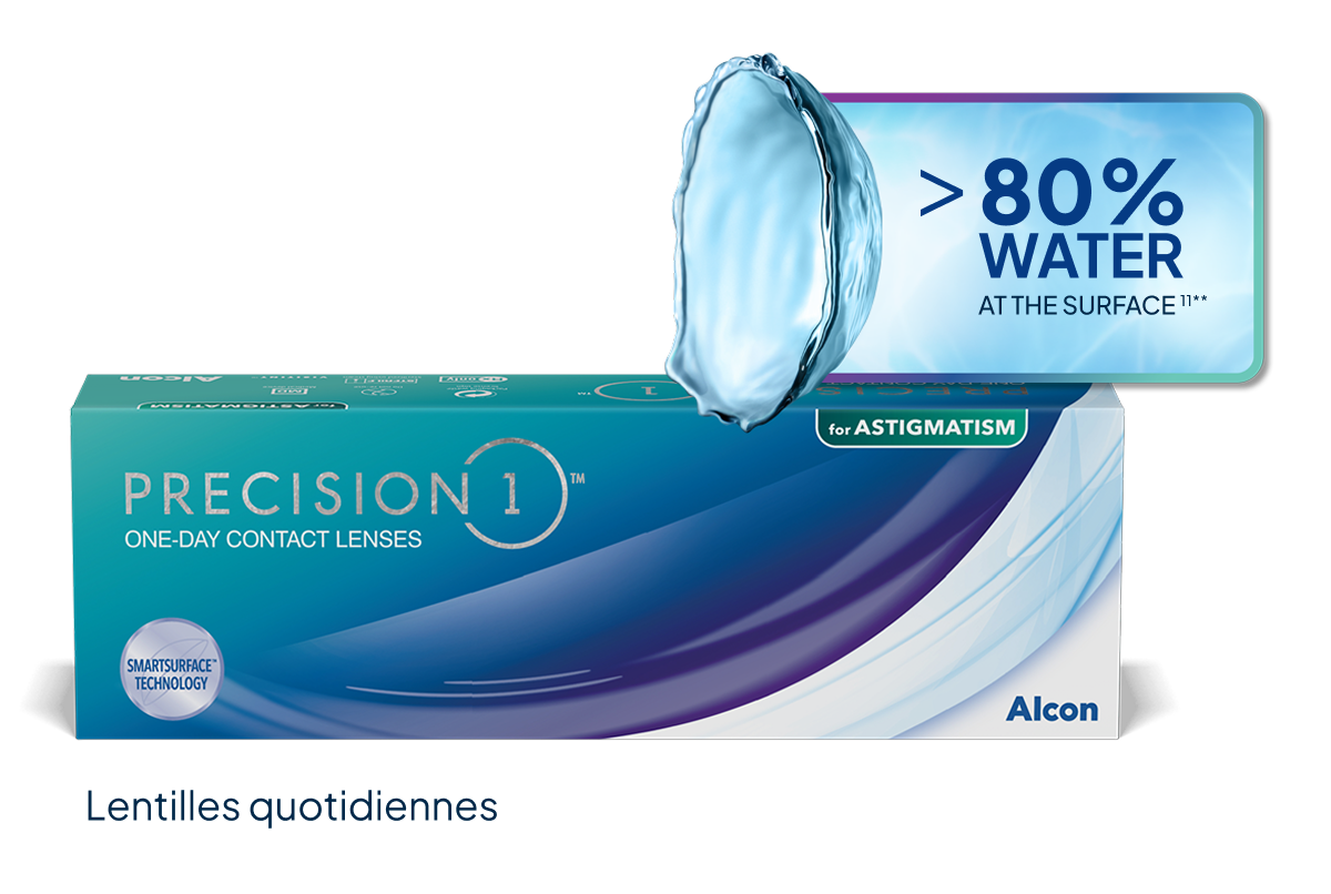 Les lentilles de contact Alcon® pour l'ASTIGMATISME utilisent PRECISION BALANCE 8|4™ – un design éprouvé, spécialement conçu pour l’astigmatisme. Grâce à ce design, la lentille se stabilise et offre une vision nette en seulement quelques secondes après l’insertion des lentilles de contact.²⁵⁶
